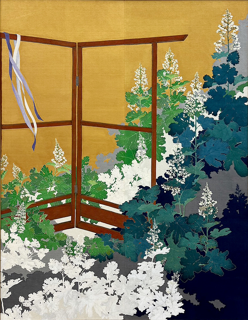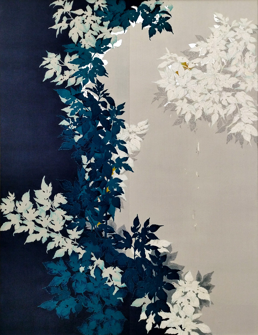私は日本伝統染織技術である手描き友禅を主な表現の技とし、絹という日本古来の素材の上に自由に模様を染め上げて作品を制作しています。